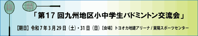 - 小学校部会へ『第17回九州地区小中学生バドミントン交流会』の 要項と 申込書と 練習会要項と 練習会申込書を掲載しました。